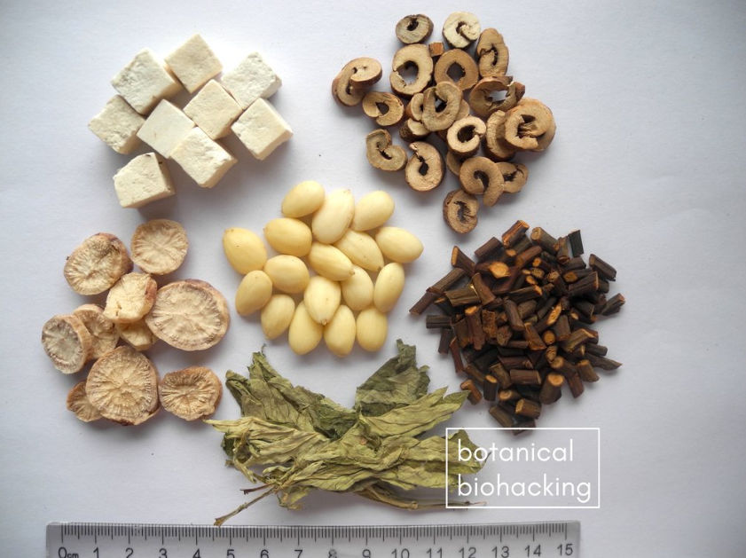 Cinnamon Twig (Gui Zhi), Poria (Fu Ling), Peony Root Bark (Mu Dan Pi), White Peony Root (Bai Shao), Wild Mountain Peach Kernel – processed (Dan Tao Ren), Mugwort Leaf (Qi Ai Ye)